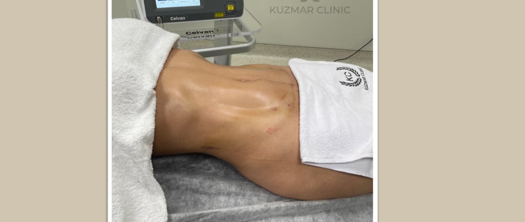 Laser lipolysis is an advanced technique that safely and effectively eliminates localized fat while promoting skin tightening. At Kuzmar Clinic, we use specific wavelengths (980 nm and 1470 nm) to treat different areas of the body, including the abdomen, arms, chin, and eyelids.